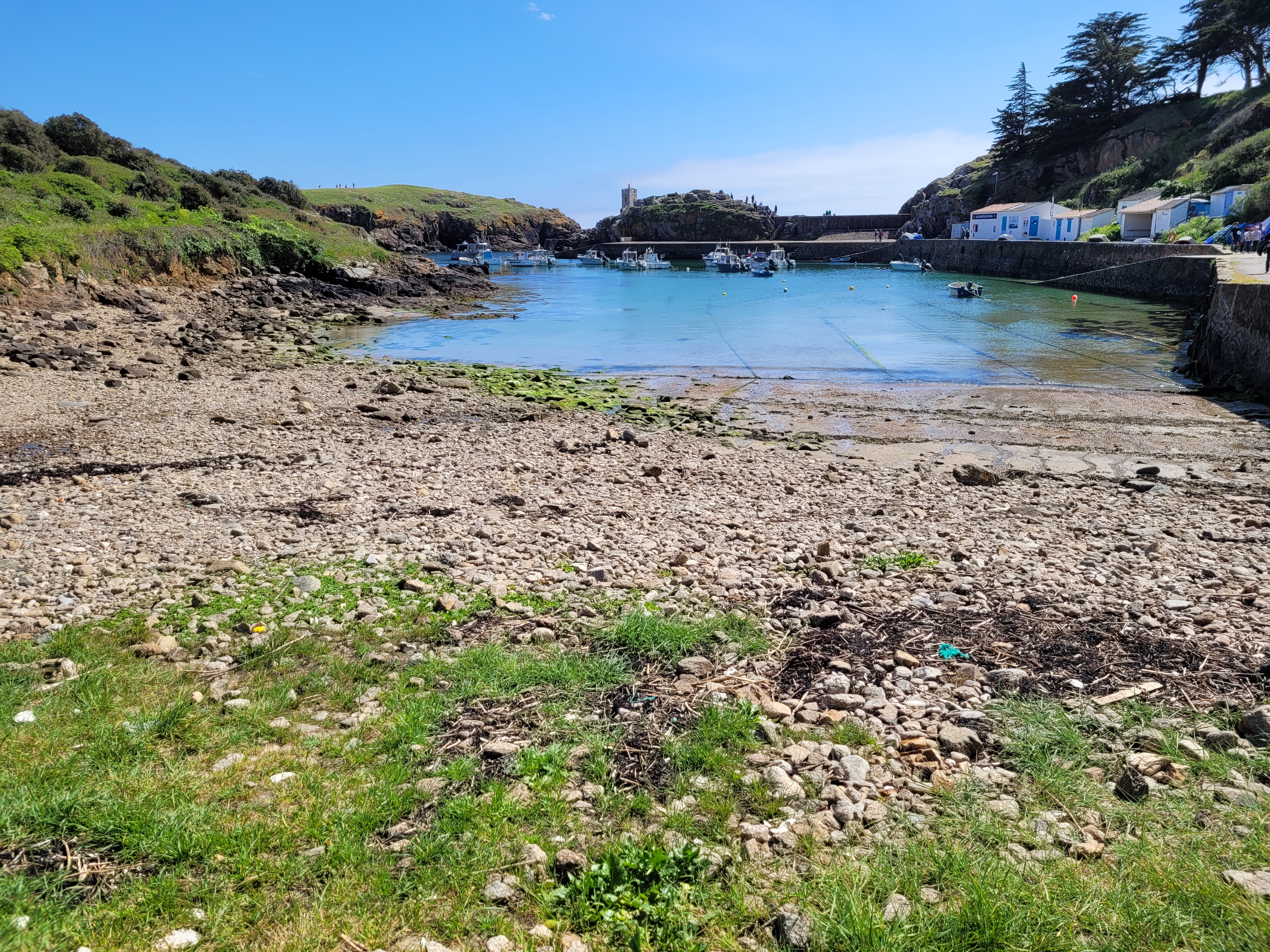 En débarquant à Port Joinville, les premières plages sont sur la gauche du port à environ 400 mètres à pied, et sur la droite c'est plutôt la ville, et plus loin encore les côtes plus abruptes de pierre. Où que vous passiez, tout est joli. Une vraie carte postale