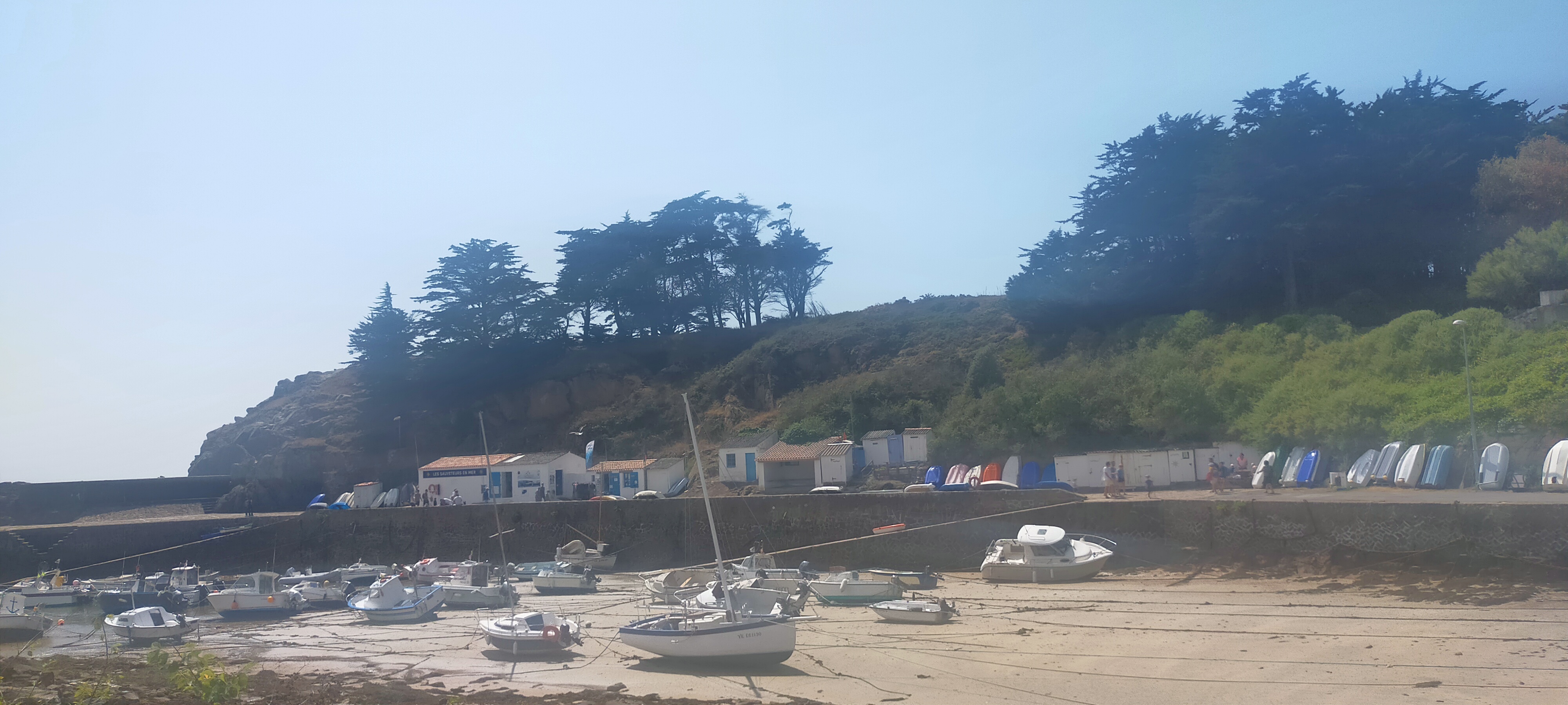 Une autre monde, une autre cadence, la belle vie à 20 bornes du continent.... Si je gagnais au loto, j'aimerai venir m'installer dans cette île et me promener au coucher du soleil sur les quais de Port Joinville.... Petit bémol : les bus... Si nous avons été pris en charge par des chauffeuses super sympa, il n'y a pas assez de rotations.... Arrivés à 9h45, nous avons pris la direction de la Plage des Sapins.... Nous devions repartir avec le bateau de 15h15.... Hélas, pour repartir de la plage des Sapins, les seuls bus étaient à 12h20 et 16h09........... Pas très pratique.... En plus, le seul taxi de l'île n'a pas répondu à mes appels !