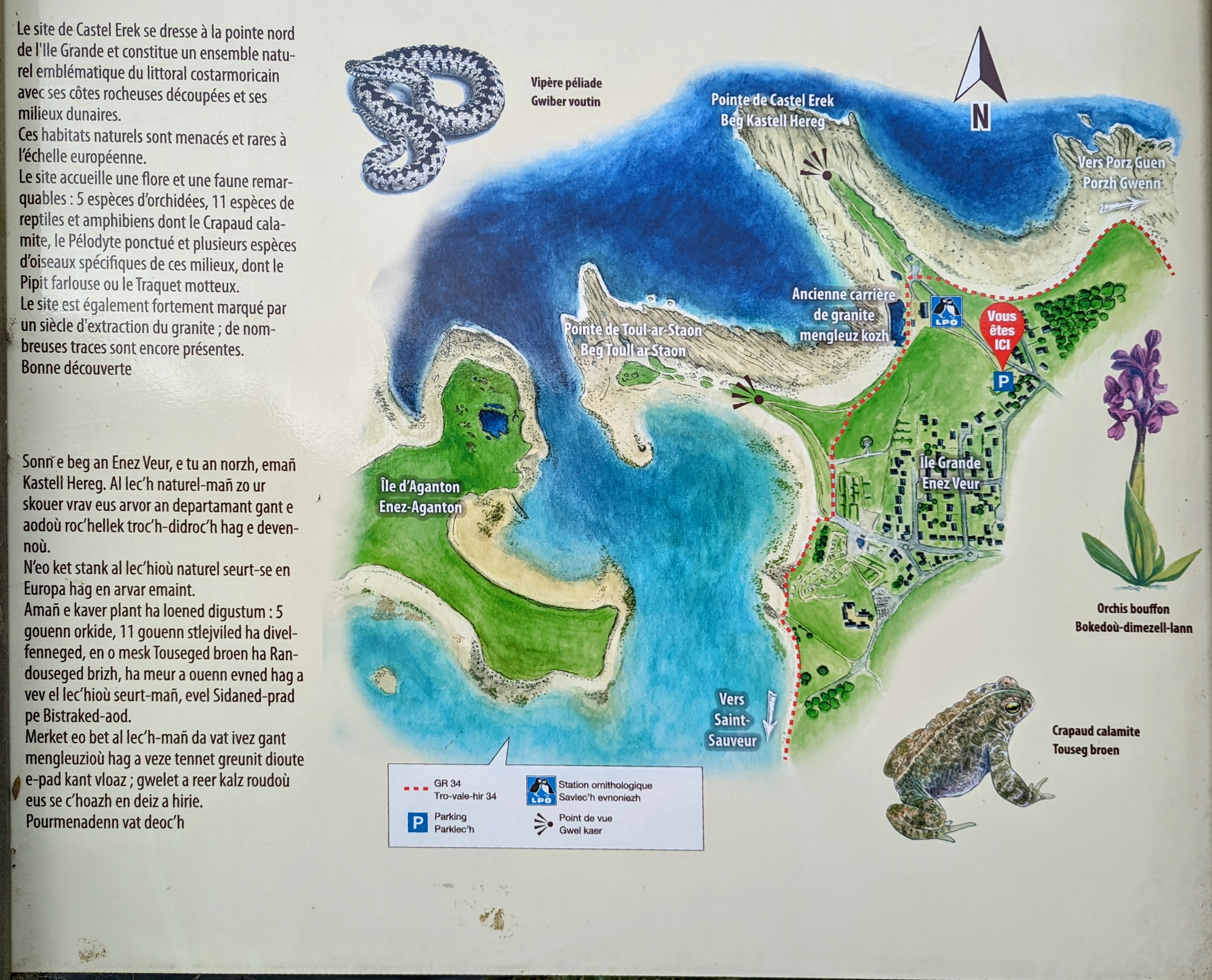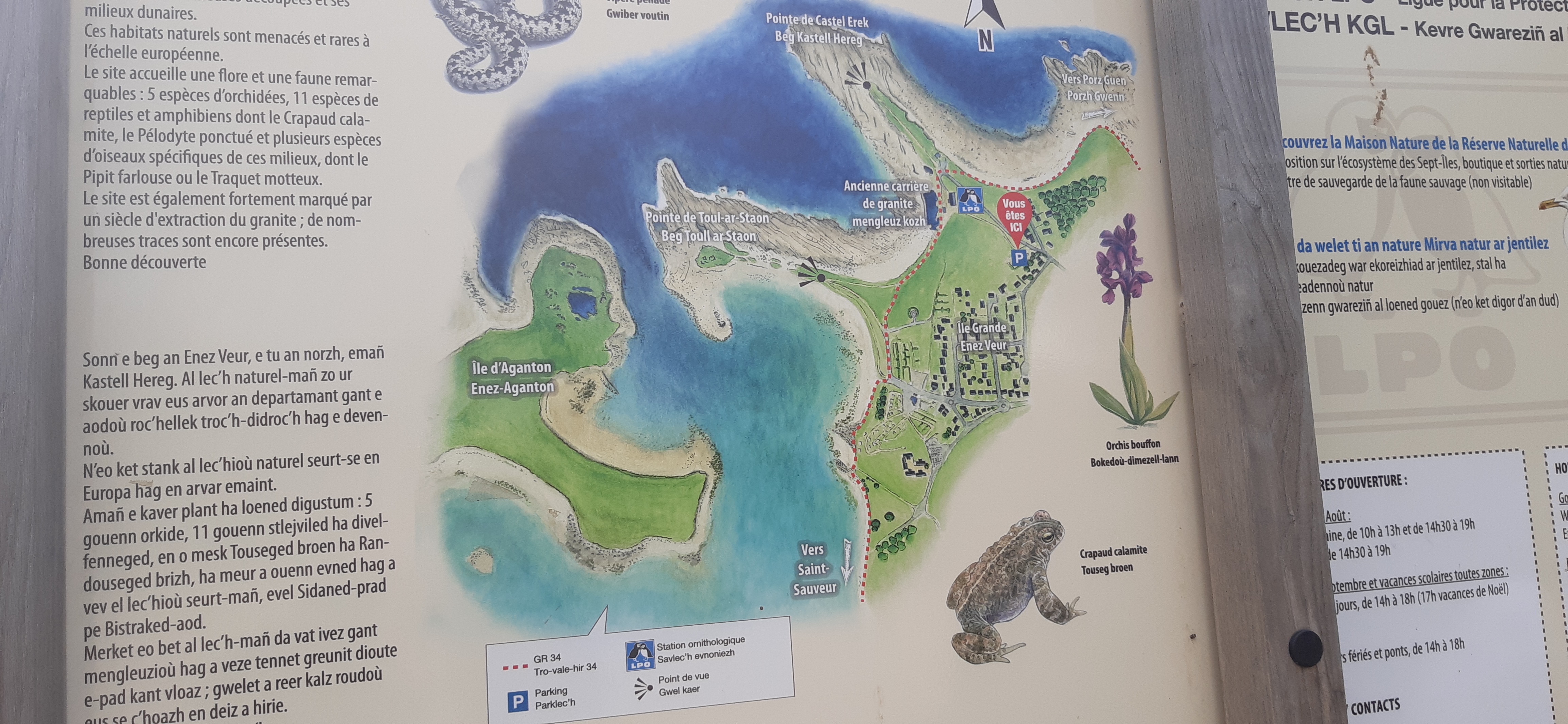 L'Ile Grande est une île située au nord de la baie de Lannion, près de Tremeur-Bodou et de Trébeurden. Elle est reliée au continent par un petit pont. Un centre ornithologique, station de la Ligne de Protection des Oiseaux, qui vient en aide aux oiseaux marins malades ou blessés, s'est installé dans la partie la plus occidentale de l'ile. Il y a là un grand parking que nous avons utilisé. Le sentier côtier permet de faire le tour de l'ile, à la découverte de paysages variés: plages, dunes de Toul Gwenn, marais de Kervoalant, le Port Saint-Sauveur et sa Fontaine, la côte rocheuse decoupée, avec le Rocher du Corbeau. L'histoire de l'île est également marquée par l'extraction du granit, pendant près d'un siècle. Le 2 août 2023, des vents à 95 km/h ont balayé l'île, nous montrant une mer très agitée, des vagues se brisant sur les rochers, spectacle inattendu et impressionnant, amplifié par l'impact des grandes marées. Une île à découvrir, restée sauvage, avec des paysages, une faune et une flore variés,