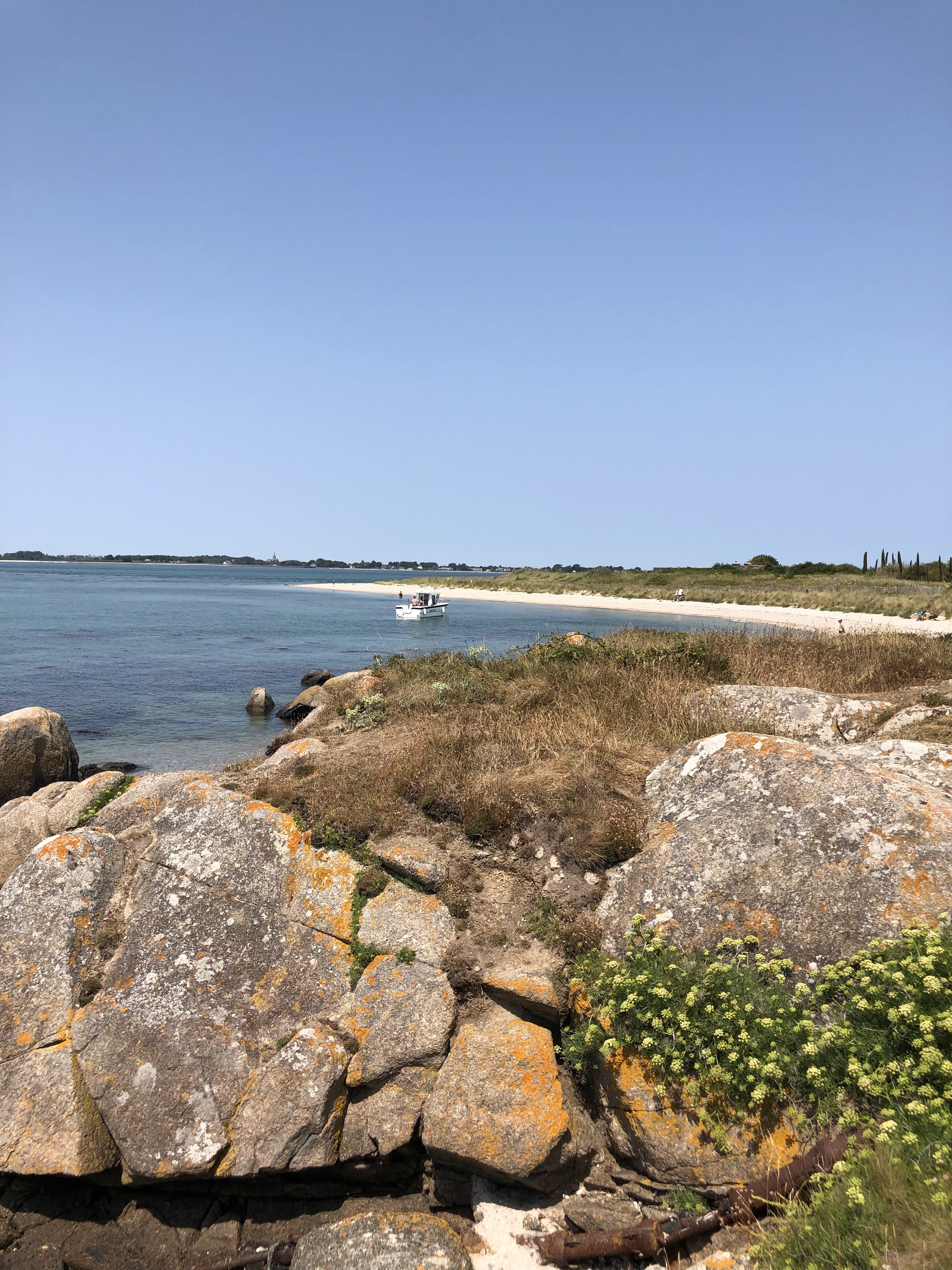 Belle île. Nous nous y sommes dirigés. La surprise a été que la « route » qui y mène est encore considérablement inondée à marée basse, jusqu'à environ la hauteur des chevilles/genoux. Mettez un short et des chaussures d'eau ou quelque chose comme ça et ce sera une expérience, sans protection aux pieds ce sera une épreuve !! Vous pouvez également prendre le bateau-taxi. Le départ se fait au quai du village. Chiens interdits sur l'île !