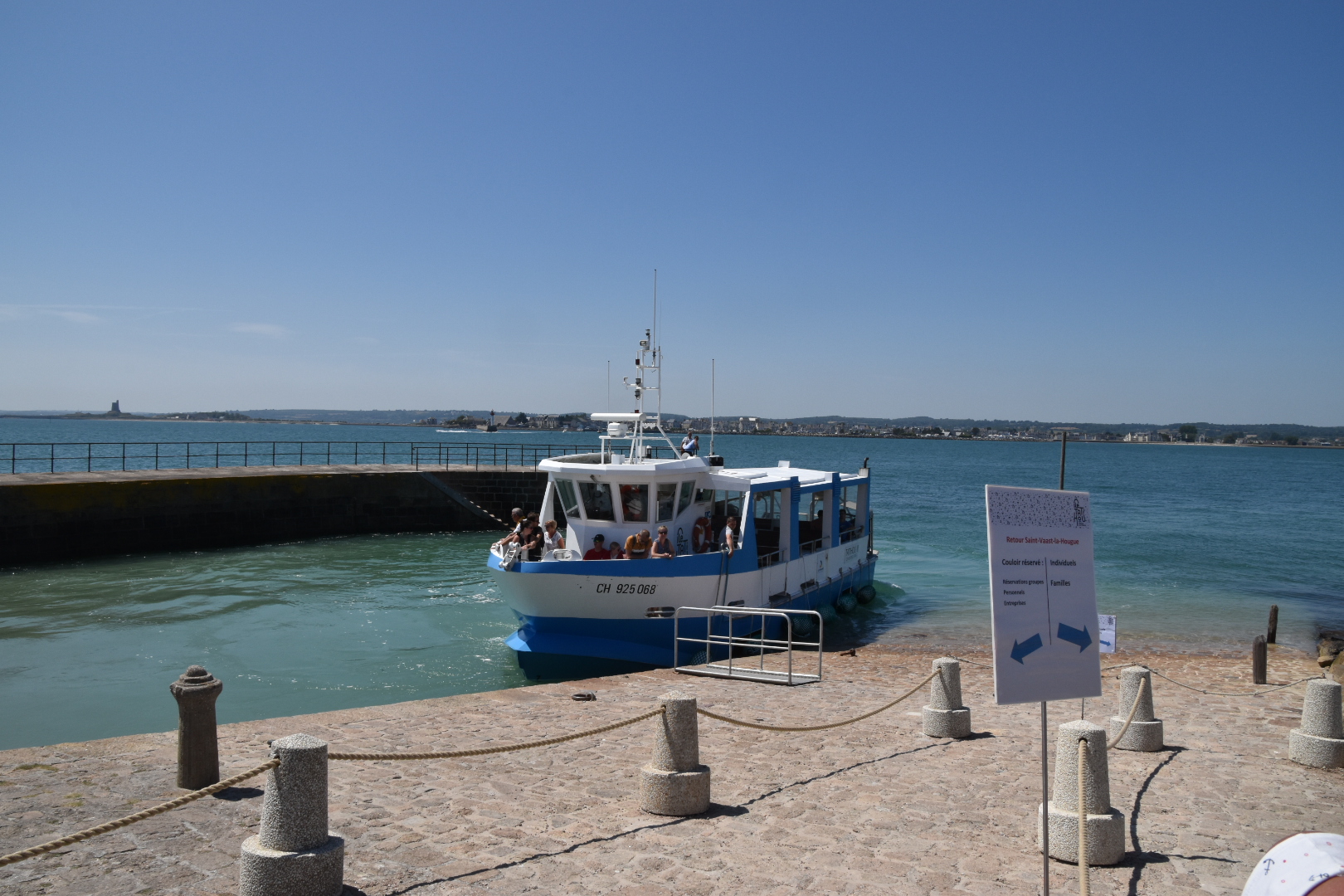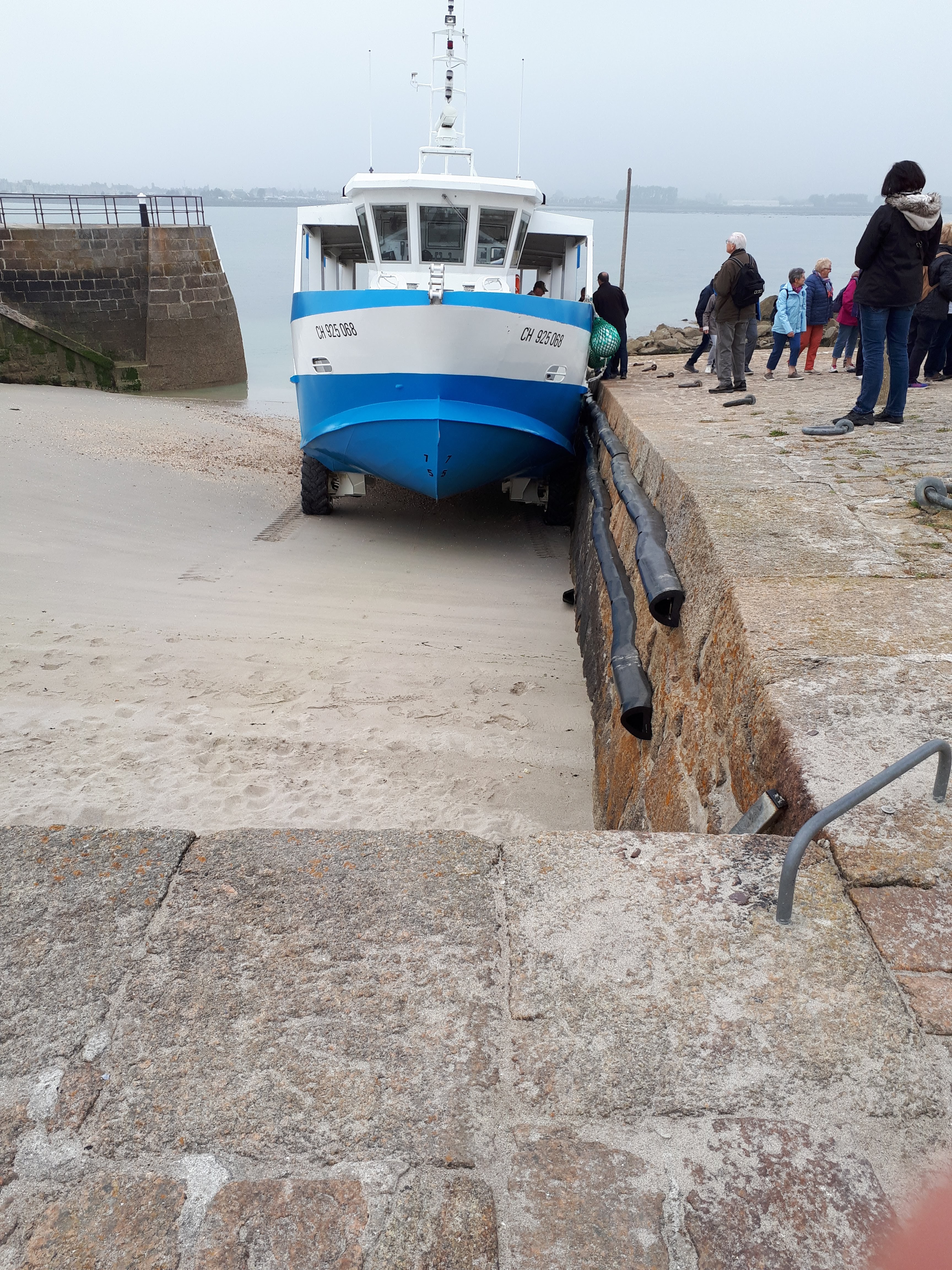 en saison il est recommandé de faire une réservation par téléphone, se présenter un bon quart d'heure avant l'heure l'heure du départ prévu qui vous est elle aussi indiqué par téléphone car ils se font en fonction de l'heure des marées bien sûr avec un plus c'est que à marée basse vu que le bateau est amphibie et sur roues et tu peux aller pour revenir de l'Île en roulant et non en navigant. Bien se présenter au moins 5 minutes avant sur le quai de départ. bien noté que les billets ne sont pas remboursables.